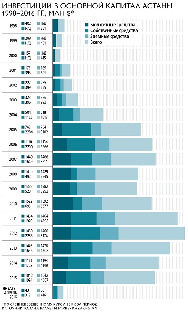 Согласно данным Комитета по статистике, в период с 1998 по апрель 2016 совокупный объем инвестиций в основной капитал Астаны составил около 7,4 трлн тенге, или порядка $49,137 млрд (по средневзвешенному курсу за период). Этот поток средств можно приблизительно разбить на три основные части (из-за отсутствия сведений по суммам инвестиций за 1998–2000 детальные расчеты сделать не представляется возможным).