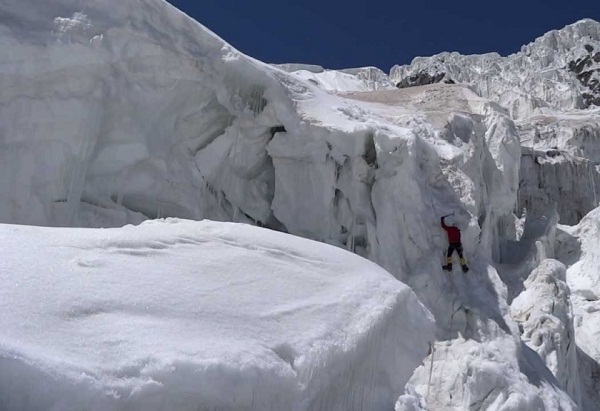 Поднялись на скалы ребра и начали переодеваться, чтобы продолжить движение по ребру. Вот в это время и раздался крик снизу. Мы прижались к скале и ждали падения льда ниже нас. Но прошла минута, а ничего не было, и Саша спросил, что ж это? Самые мрачные мысли пронзили меня, так как я понял, что обвалился лед на самом верху, и я ответил: «Наверное, наверху, держись...»