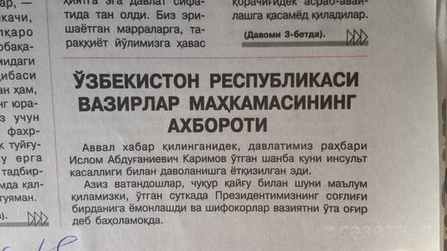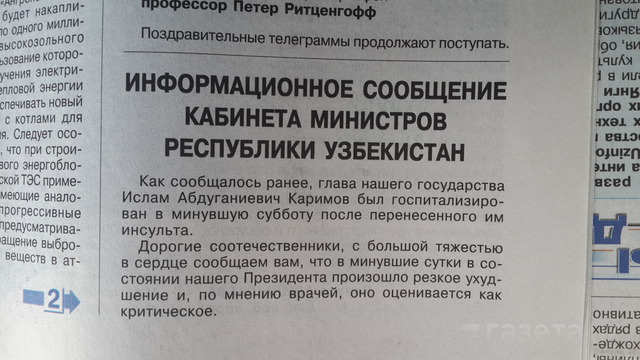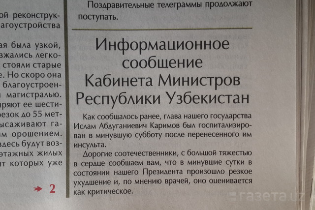 Газеты Узбекистана в пятницу 2 сентября опубликовали сообщение Кабинета Министров о состоянии Президента Ислама Каримова.