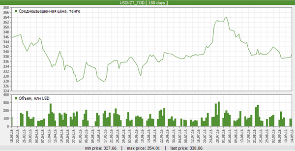 Динамика соотношения тенге/доллар за год. Данные KASE