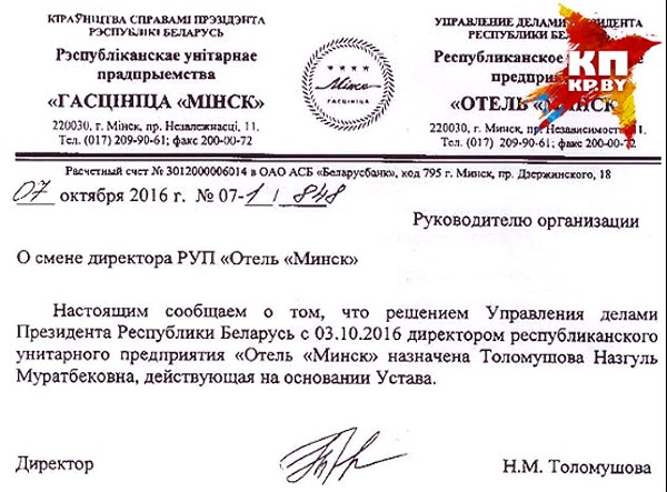 Как удалось узнать «Комсомолке», с 3 октября новым директором отеля «Минск» стала Назгуль Муратбековна Толомушова - так решили в Управлении делами президента, в ведомстве которого находится гостиница.