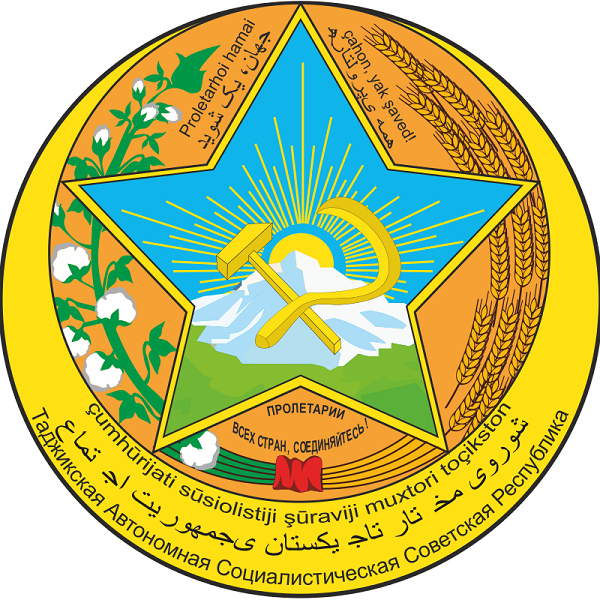 Герб Таджикской АССР в 1929—1931 годах. Название республики написано таджикскими латиницей и арабским письмом и на русском кириллицей