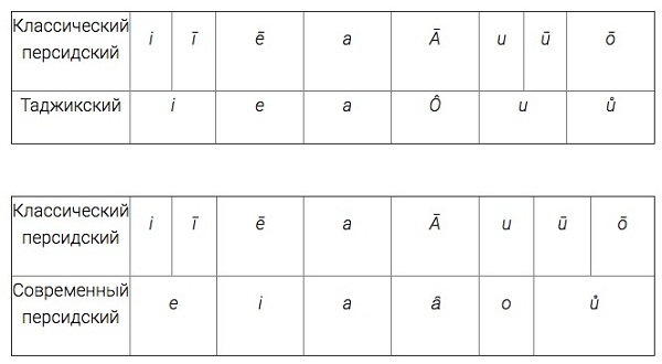 Различия в персидском и таджикском вокализме (системе гласных звуков) можно увидеть на двух схемах (обозначения звуков даются по изданию «Основы иранского языкознания»).