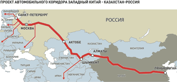 Кстати, насчёт поворота. Был и такой вариант, учитывающий интересы России, а именно: сохранив трассу в Ленинградскую область в качестве параллельной, основную коридорную артерию направить – через Белоруссию и Литву – к портам Калининградской области. Тем более что этот сектор северо-запада бывшего СССР имеет сравнительно высокое качество автодорожных покрытий, высокую пропускную способность железных дорог. Что, в свою очередь, потребует меньших затрат (в сравнении с трассой на порты Ленинградской области). А в географическом плане это – кратчайший маршрут в Восточную и Центральную Европу из Казахстана и с запада Китая.