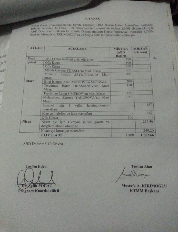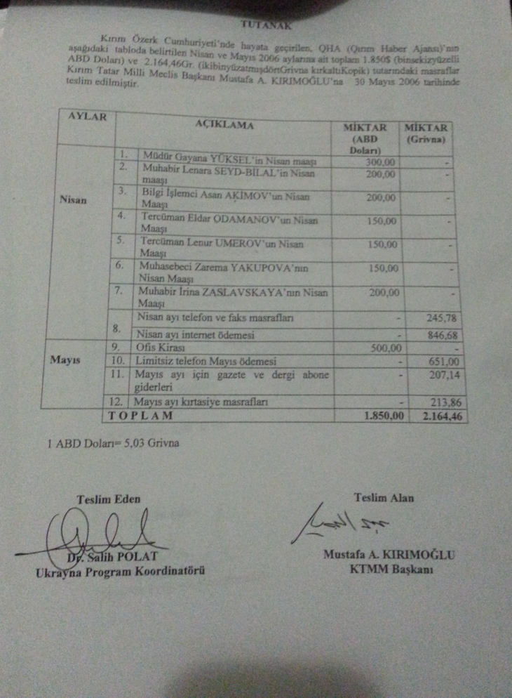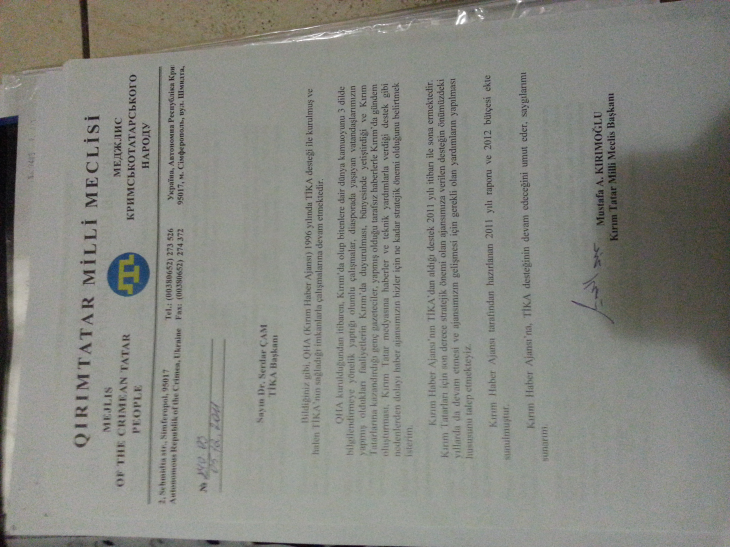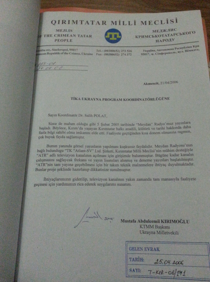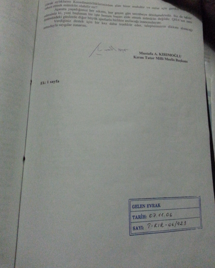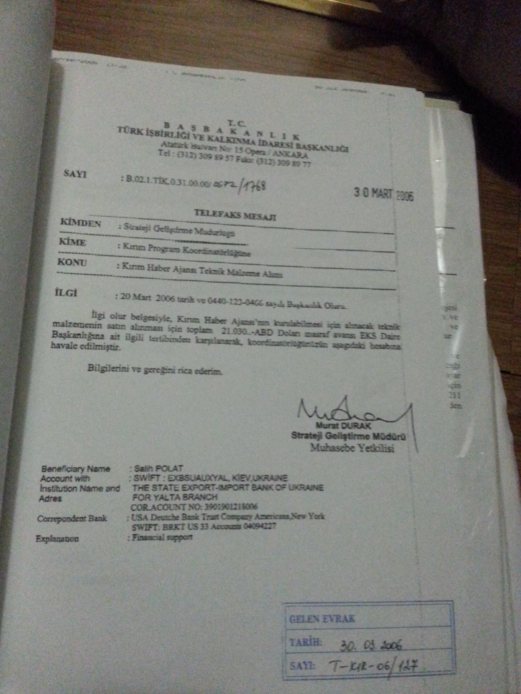 Ссылаясь на документы, автор утверждает, что Анкара более 6 лет поддерживает «знаменитого крымского татарина Мустафу Джемилева». О происхождение фотокопий не сообщается. Среди материалов - переписки между сотрудниками TIKA (Турецкое управление по сотрудничеству и развитию - аналог USAID), а также между TIKA и главой «Меджилиса» Джемилевым.