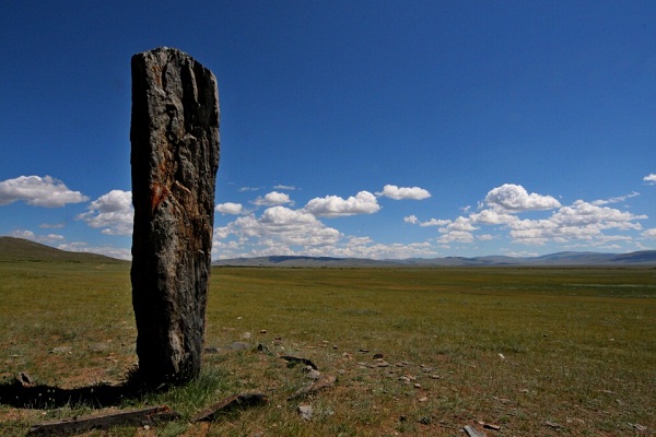 Первым объектом оказалась каменная стела, возвышающаяся метра на три над землей. На ней не было никаких надписей, но понятно было, что она рукотворна: кто-то же тащил это длинный камень с горы, вкапывал в землю. Зачем? Таких стел в Великой степи от Дальнего Востока до западных границ России довольно много. Называют их оленными камнями, если на них есть рисунки или, что редко, надписи, и балбалами, если это, чаще всего, неотесанные камни без рисунка. И чаще всего, как считают ученые, их устанавливали у могил предков, в местах, где приносились жертвы или произошли какие-то знаменательные события.