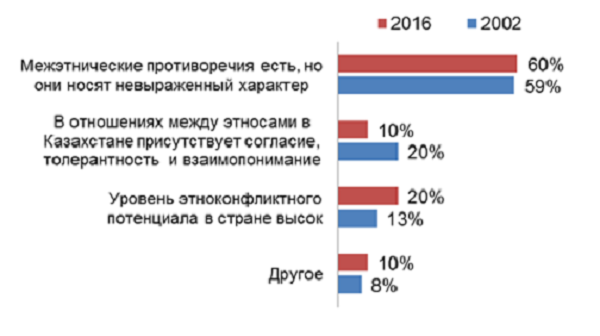 Сравнительный анализ результатов двух исследований – 2002 и 2016 годов – выявил как сходства, так и заметные различия в оценках экспертов. Сегодня, как и 14 лет назад, устойчиво большинство экспертов считает, что межэтнические противоречия в Казахстане неактивны и носят не ярко выраженный характер.