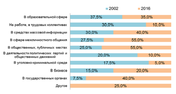 Выявилась и главная деталь межэтнических проблем страны. Так, в 2016 году по сравнению с 2002-м годом, по оценкам экспертов, заметно снизилось проявление межэтнических проблем в трудовых коллективах, деятельности политических партий и общественных объединений, в уголовно-криминальной среде.