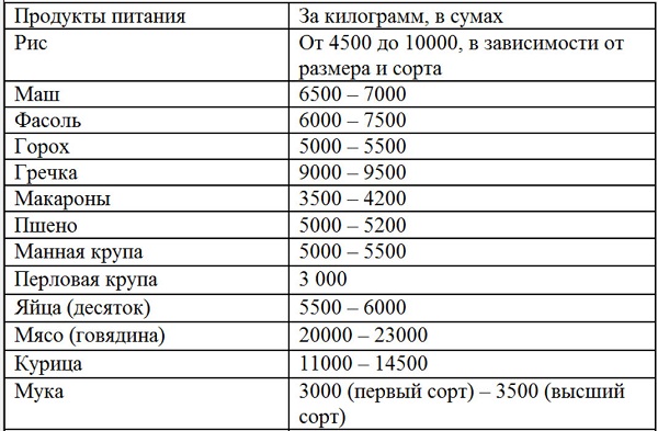 На сегодняшний день средние цены на основные продукты питания (фрукты, колбасные изделия и сыры, как непозволительную роскошь, мы учитывать не стали) на ташкентских базарах таковы:
