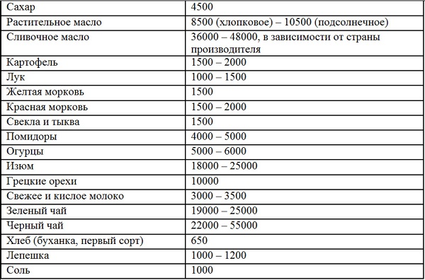 Итак, предположим, что человек в месяц съедает: восемь килограммов самой дешевой картошки (12000), пять килограммов лука (5000), два килограмма риса по средней цене в семь тысяч сумов (14000), один килограмм гречки (9000), два кило макарон (7000), тридцать среднего размера яиц (16500), один килограмм говядины (20000), два кило куриного мяса (28000), три кило муки (9000), два кило сахара (9000), литр растительного масла (хлопкового, 8500), полкило масла сливочного (18000), килограмм желтой моркови (1500), пару кило моркови красной (3000), по килограмму свеклы и тыквы (3000), три килограмма помидоров (12000), кило огурцов (5000), три литра свежего молока (9000) и два литра кислого молока (кефира, 6000), полкило черного чая (11000) и полкило чая зеленого (9500), пятнадцать буханок хлеба (15000) и килограмм соли (1000). Итог – 232 тысячи сумов.