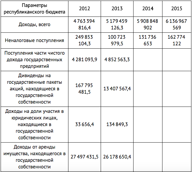 Так как в число этих юрлиц входит ряд крупнейших компаний страны, то, разумеется, ожидается, что от них будут дивиденды и доли от доходов, что поможет пополнить бюджет. Но если мы посмотрим таблицу 2, то выясним, что это не так. Если не считать 2012 год, в остальные годы доходы от организаций с государственным участием не превышают пары десятков миллиардов тенге, и от сдачи в аренду государственной недвижимости доходы больше. Но с другой стороны, в 2012 году дивиденды были тоже больше? Почему?