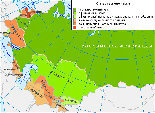 Только Белоруссия придала русскому языку статус государственного. В Кыргызстане он является официальным, а в Молдове, Казахстане, Таджикистане и в Украине – языком межнационального общения. В Грузии и Армении статус русского языка формально не определен (фактически имеет статус иностранного языка).