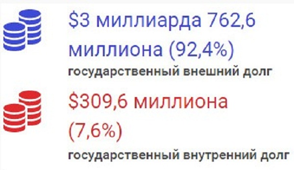 Соотношение госдолга к прогнозному ВВП за 2016 год составило 60,9 процента, а государственного внешнего долга к прогнозному ВВП – 56,3 процента. Таким образом, государственный долг КР составил 276 миллиардов 788,3 миллиона сомов ($4,072 миллиарда).