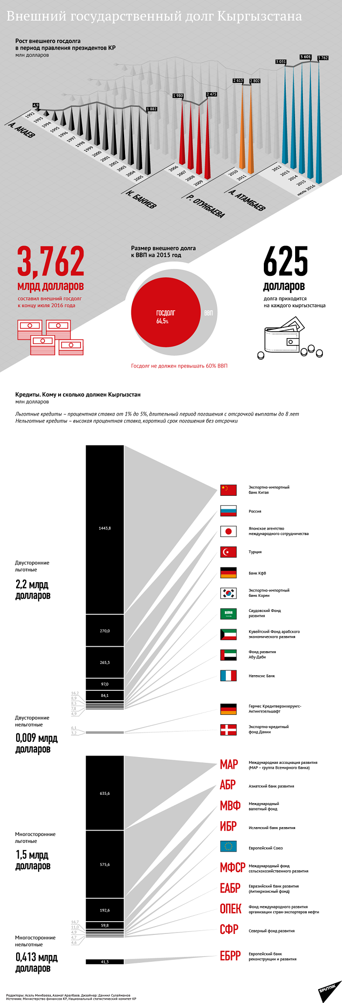 По словам Касымалиева, госдолг страны не должен превышать 60 процентов от ВВП. Сегодня он составляет 57,2 процента, но 1 января следующего года вступит в силу Бюджетный кодекс, который отменит это ограничение.