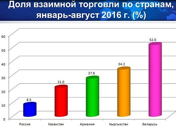 Падение взаимного товарооборота по странам было неравномерным. Армения, ставшая участником ЕАЭС с января 2015 г., продемонстрировала прирост торговли с партнерами по союзу на 55,2%. Но ее общий объем все еще невелик и по итогам девяти месяцев составил всего 274,1 млн. долл. Торговля Белоруссии со странами союза незначительно сократилась (на 2,7%), а ее общий объем составил более 8 млрд. долл. Гораздо более значительное падение продемонстрировала Россия. Ее товарооборот со странами ЕАЭС по сравнению с январем - сентябрем прошлого года сократился на 15,6% (до 18,3 млрд. долл.). «Лидерами» же стали среднеазиатские участники ЕАЭС – Казахстан и Киргизия. Торговля первого с союзными государствами упала на 31,6% (до 2,7 млрд. долл.), а второй – почти вдвое (на 46,6%, до 187 млн. долл.).