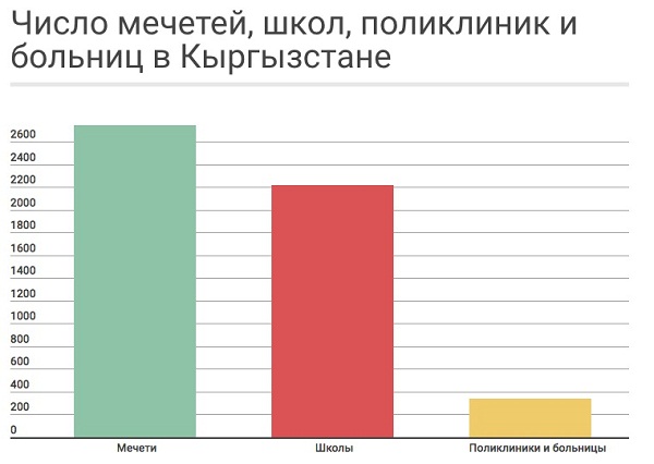 По официальным данным за 2015-2016 годы всего в Кыргызстане насчитывается 2 743 мечети, 2 218 школ, 338 больниц и поликлиник.
