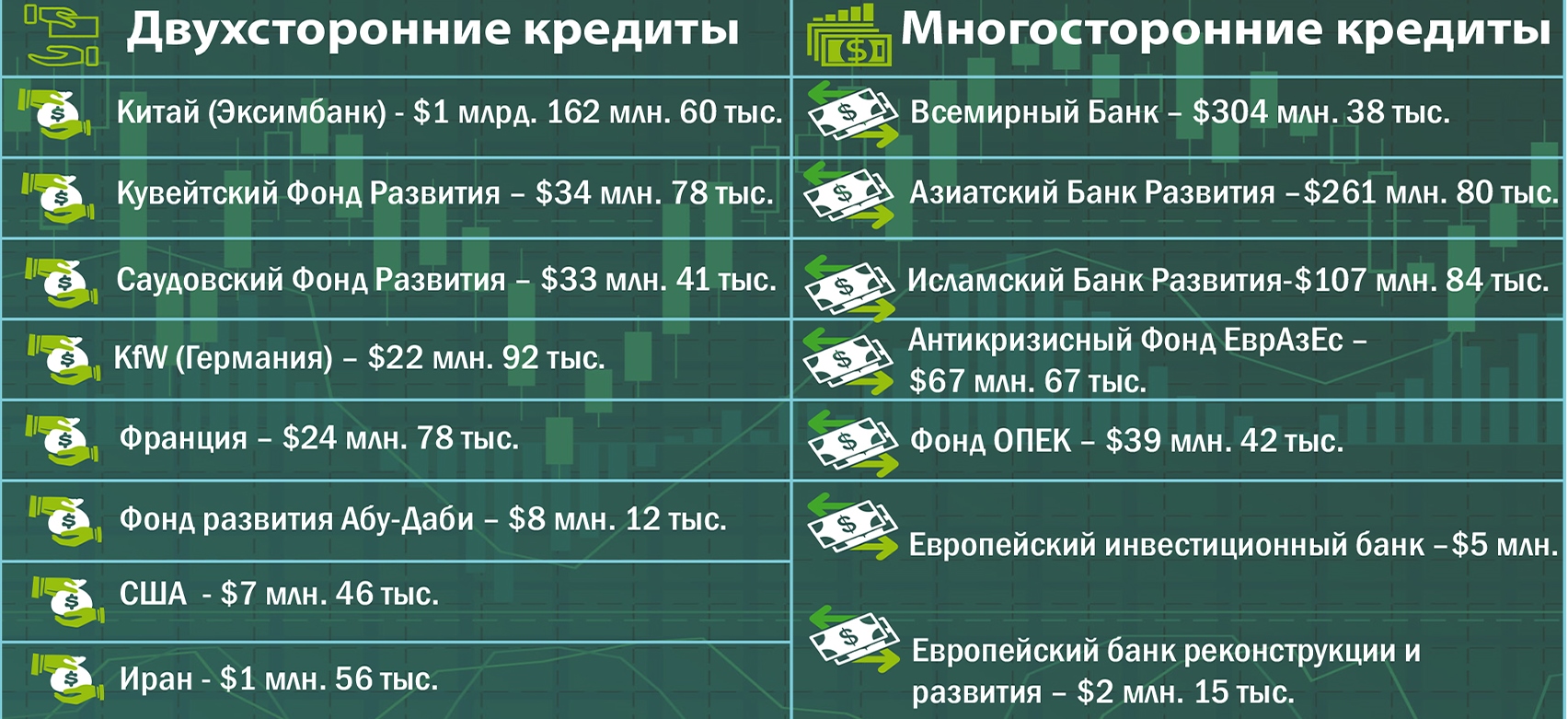 Главным нашим кредитором является Китай. Поднебесной наша страна задолжала в общей сложности почти 1,2 миллиарда долларов. Это составляет более 52% от общего размера внешнего долга Таджикистана, который близится к 2,3 миллиарда долларов.
