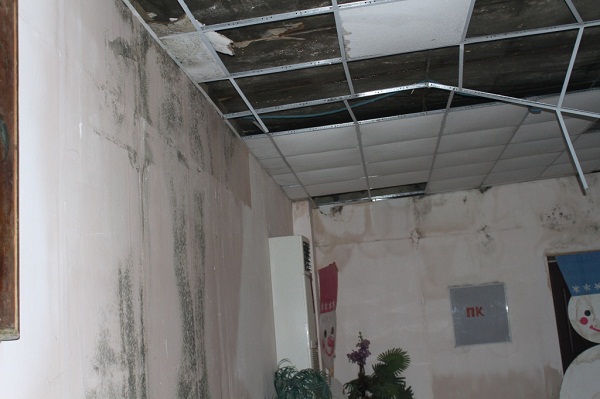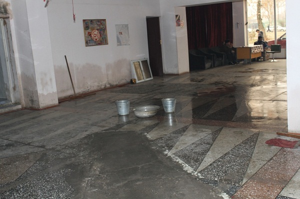 Спектакль продолжался, но нам не давал покоя факт, что попасть в зал через фойе оказалось невозможным. Через боковую дверь мы все-таки решили туда пройти и сразу же поняли, почему зрителей лишили даже вешалки. В фойе на каждом метре стояли тазы и ведра, в которые капала вода; потолок уже успел промокнуть так, что в нем зияли огромные дыры. В дополнении ко всему резкий запах плесени и сырости – видимо, протекает крыша давно.