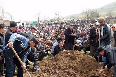 В день похорон молодые люди, из числа друзей детей усопшего, идут рыть могилу. После захоронения все возвращаются к дому покойника, слушают поминальную молитву и расходятся. Все. Никакого застолья, никакой трапезы. На поминки также готовится еда, обычно это плов и салаты. Но без излишеств, в смысле, чтобы заворачивать всем участникам устуканы или еще что-то из продуктов. И то же самое на седьмой день, месяц, сорок дней и годовщину. Если гости издалека, то обычно соседи зазывают их к себе в дом попить чаю и поесть. В доме покойника в этот день ничего не готовят.