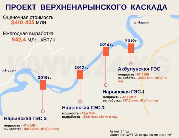 О строительстве каскада на реке Нарын договаривались президенты двух стран. В сентябре 2012 года во время официального визита Владимира Путина в КР подписали соглашение. Тогда, напомним, Россия списала Кыргызстану долг практически в $500 миллионов, а совместный проект стоимостью $410–425 миллионов решили реализовать на паритетных условиях.