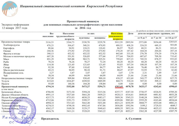 Так вот, у меня на руках пенсия — 5 173 сома. Данная средняя пенсия была установлена в октябре прошлого года (подробнее). Государство заботливо определило прожиточный минимум для людей пенсионного возраста.