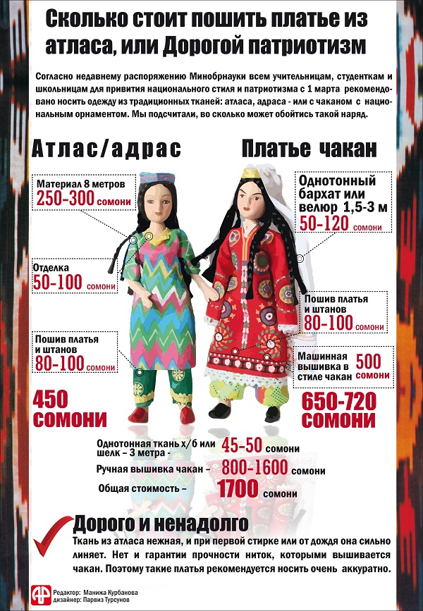 В рекомендательном письме министра в вузы и школы страны говорилось, что с 1 марта 2017 года все учительницы, студентки и школьницы должны приходить на занятия в национальной одежде из атласа и адраса.