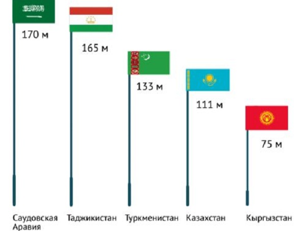 Помимо стран Центральной Азии высотой флагштока также отличились Северная Корея (160 метров), Иордания (126,8 м.), ОАЭ (123 м.), в Малайзии и Брализии по 100 метров.