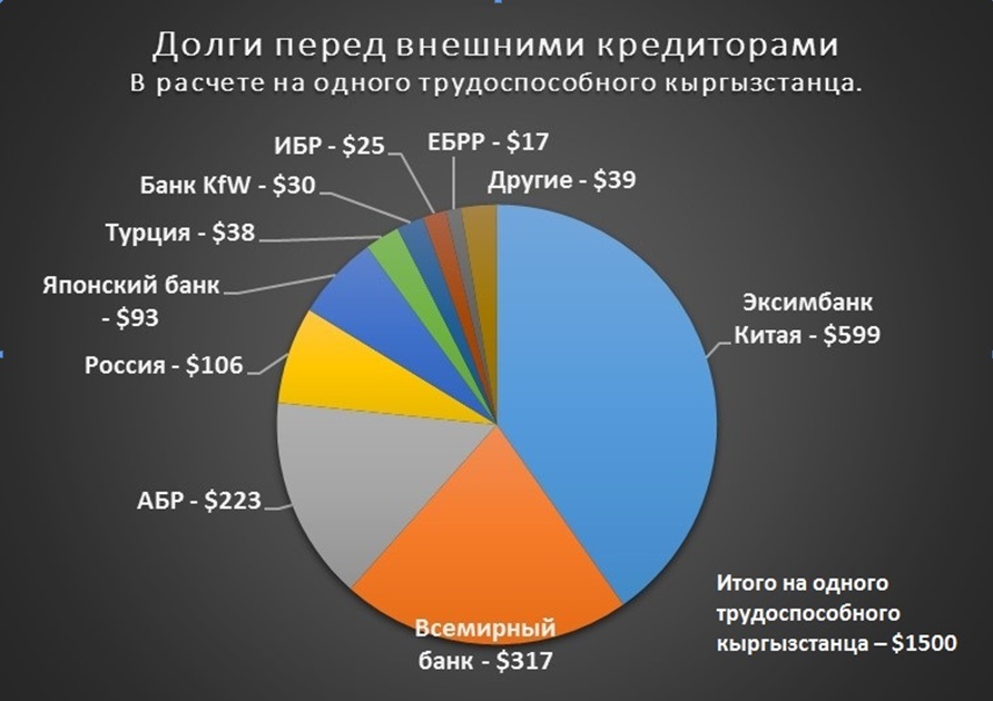 Самый большой долг сформировался перед Эксимбанком Китая – $1 млрд 523 млн. Учитывая, что в Кыргызстане 2 млн 544,3 тыс. трудоспособных граждан (последние данные Нацстаткома на август 2016 года), размер долга на каждого из них составляет $600.