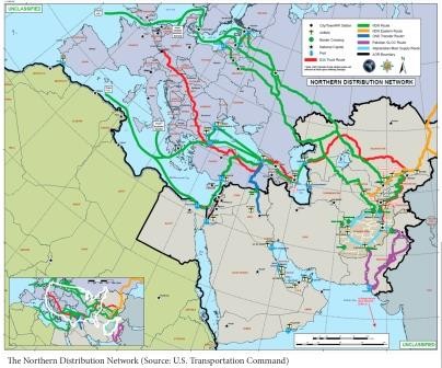 В этом плане феерически ярким примером является военная угроза транспортно-логистического присутствия Вооружённых Сил США и НАТО по Северной дистрибутивной Сети (СДС, the Northern Distribution Network - NDN), которая является идеальным руслом (каналом или колеёй) для направления на Тюменский газонефтяной комплекс и Поволжье повстанческих сил (Insurgency), быстро собираемых со всего мира и концентрируемых в районах Центрально-Азиатского региона (особенно Ферганской долины), Северного Кавказа, Поволжья и российско-казахстанской границы из интернационалистического отребья в 5 – 20 тысяч штыков (что сегодня технологически отработано в Сирии).
