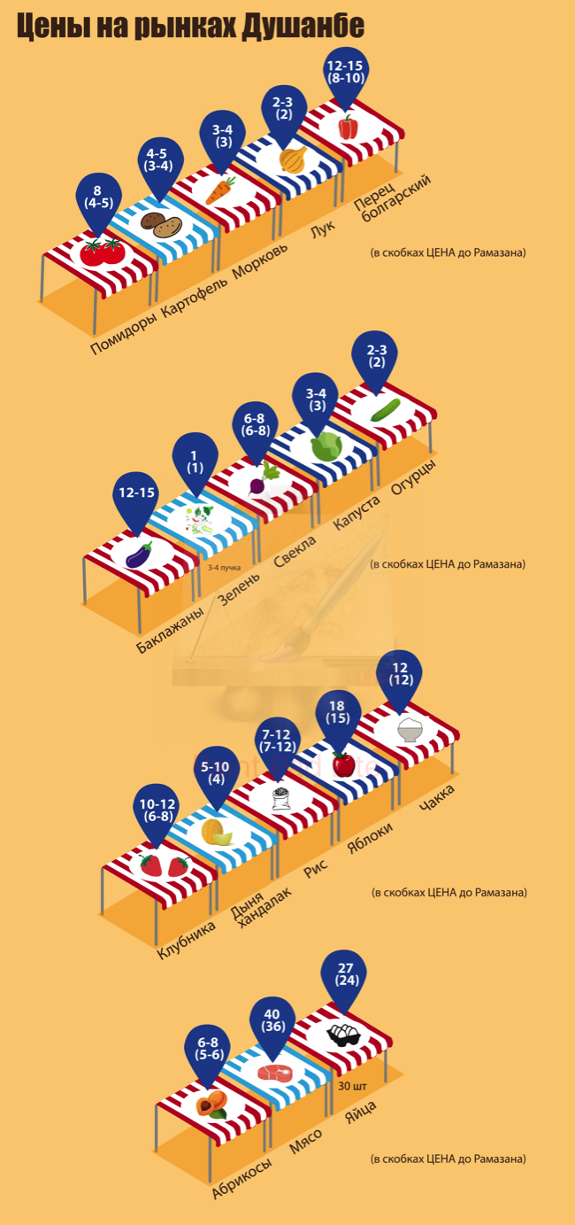 Отметим, что цены в регионах республики сильно разнятся, поэтому мы указываем только столичные цены, принимая во внимание, что сам по себе Душанбе является «импортером» сельскохозяйственного продовольствия.