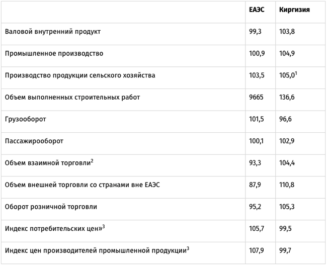 Доля взаимной торговли с государствами — членами ЕАЭС во внешней торговле Кыргызской Республики по итогам 2016 г. составила 35,9%, в том числе 27% экспорта и 39,4% импорта товаров. При общем сокращении объема взаимной торговли по Союзу в целом на 6,7% к уровню 2015 г. внутрисоюзные поставки республики возросли на 4,4%. При этом произошел рост экспорта продовольственных товаров и сельскохозяйственной продукции на 82%, текстильных изделий и обуви — на 94,5%, древесины и целлюлозно-бумажных изделий — 16,8%. А экспорт товаров во взаимной торговле с Казахстаном увеличился на 17,4% за счет роста поставок руд драгоценных металлов, фруктов и овощей, одежды.