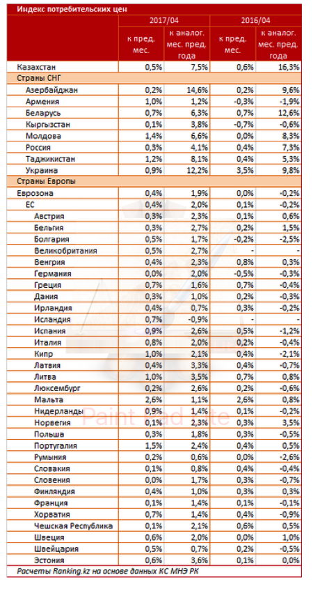 По итогам апреля, годовые показатели инфляции в РК заметно уступали Азербайджану, где потребительские цены подскочили на 14,6%, Украине (12,2%) и Таджикистану (8,1%). В то же время у соседей по ЕАЭС показатели инфляции ниже, чем в РК: в Кыргызстане — 3,8%, в России — 4,1%, в Белоруссии — 6,3%, в Армении — 1,2%.