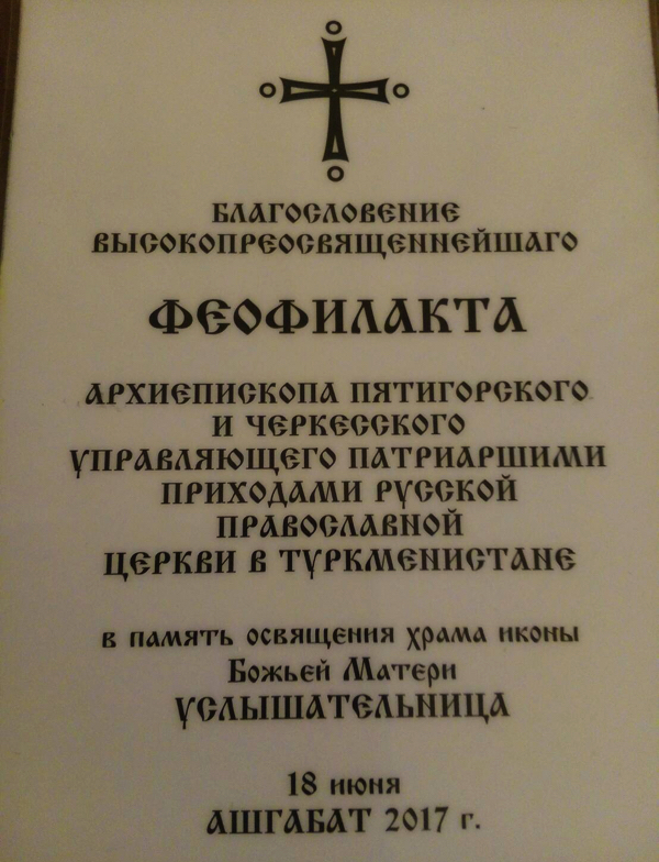 18 июня в столице Туркменистана был освящен новый православный храм иконы Божией Матери «Услышательница». Он расположен на территории Патриаршего духовно-административного центра и Храма Святителя Николая Чудотворца. Освящение провел Архиепископ Пятигорский и Черкесский Феофилакт, временно управляющий Патриаршим благочинием приходов Русской Православной Церкви в Туркменистане, находящийся с визитом в стране.