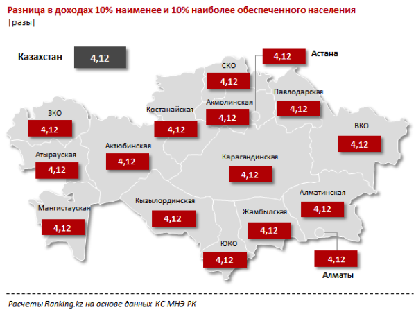 Самая «глубокая» разница между доходами 10% наиболее и 10% наименее обеспеченных слоев населения в республике - в ВКО, где богатые жители региона зарабатывают в 7 раз больше, чем самые бедные в области. Также сильная дифференциация в доходах в Карагандинской области (разница составляет 6,41 раза) и в СКО (6,18 раза).