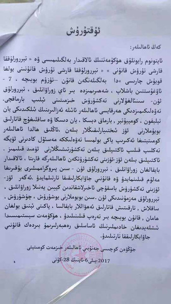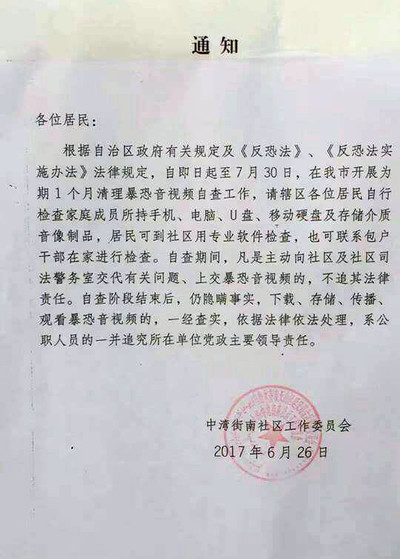 "28 июня в Урумчи было распространенно сообщение на китайском и уйгурском языках, в котором говорится, что «с сегодняшнего дня и до 30 июля в городе запущена акция по самопроверке аудио и видео». В нем жителям предписывается осуществить личную проверку мобильных телефонов, компьютеров, жестких дисков у своих домочадцев на наличие запрещенных аудио и видео материалов. Жителей призывают сделать это в добровольном порядке, но все при этом понимают, что власти требуют обязательного исполнения данного предписания", - говорится в статье "Radio free Asia".
