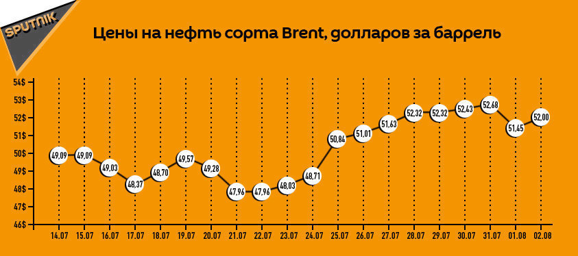 Некоторое снижение цены нефти на рынке все же наблюдается: октябрьские фьючерсы на нефть сорта Brent на торгах в среду понижались, но незначительно, и к середине дня торговались примерно по 52 доллара за баррель.