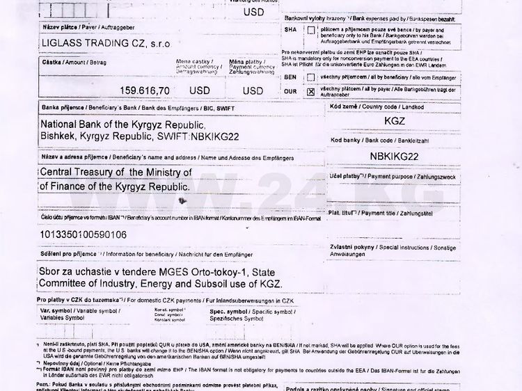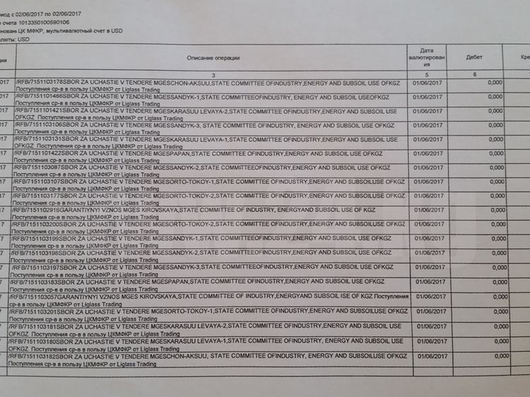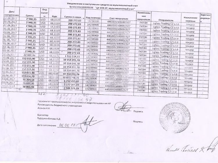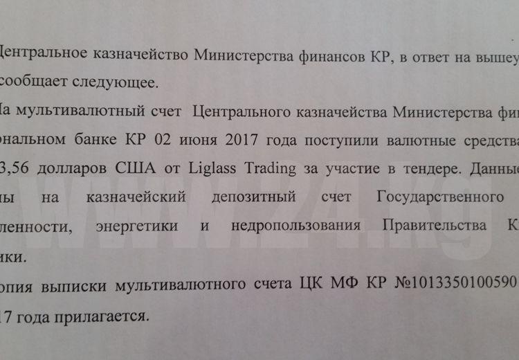 Чешская газета Lidovky опубликовала информацию, что Liglass Trading не вносила гарантийный взнос правительству Кыргызстана в $1,2 миллиона за участие в тендере. Компания представила только банковский чек.
