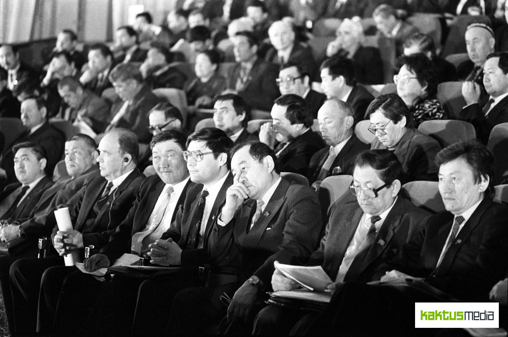 Джумабек Ибраимов (крайний справа в первом ряду) в зале заседания 3-й сессии Верховного Совета Республики Кыргызстан 12-го созыва. 1991 год. Фото предоставлено Государственным архивом кинофотофонодокументов КР