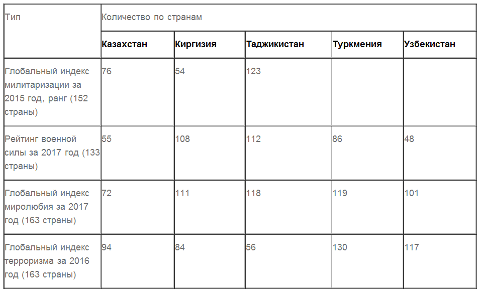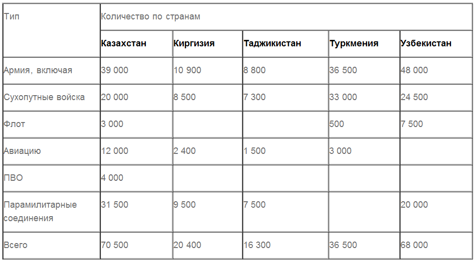 При этом треть из них — это парамилитарные соединения (национальная гвардия, пограничники, служба государственной охраны и т.д.). По величине армии на первом месте Узбекистан, затем Казахстан и Туркмения. Таджикистан и Киргизия не могут содержать большие армии из-за бедности.