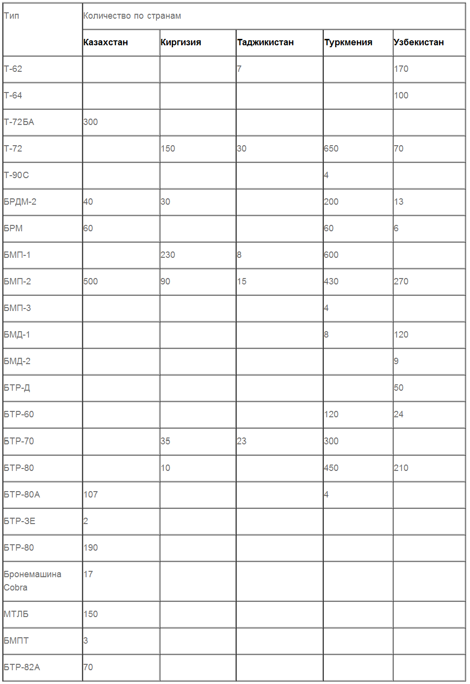 Первым идет основа сухопутных сил — бронетехника. Бесспорным лидером по ее количеству является Туркмения, на втором месте Казахстан, а дальше Узбекистан. У Таджикистана танков мало, впрочем, учитывая гористый характер местности, они не очень там и нужны. По танкам в Киргизии есть сомнения в исправности такого количества.