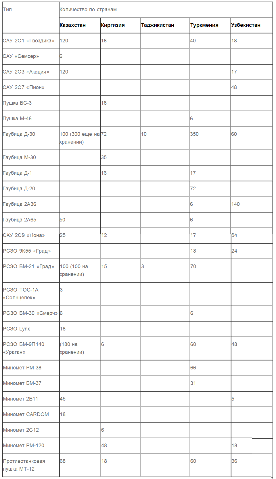 Несмотря на то, что у Киргизии, Таджикистана и Туркмении на вооружении стоит ряд пушек, гаубиц и минометов времен 40-х годов, не стоит их недооценивать — они вполне еще боеспособны. Безусловным лидером по артиллерии выглядит Казахстан — у него больше всего самоходных артиллерийских установок и, что особенно важно, 152-мм САУ 2С3 «Акация», а также РСЗО. Сочетания большой огневой мощи, дальности стрельбы и мобильности тут хватит на любой конфликт.
