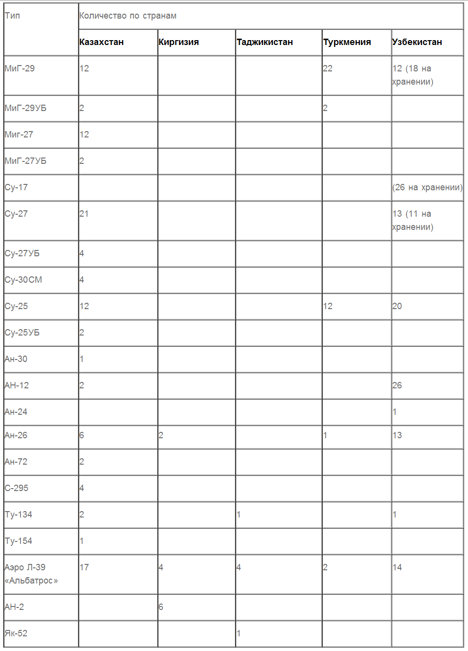 По сути дела, боевые самолеты есть только у трех стран — Казахстана, Узбекистана и Туркмении, а у Киргизии и Таджикистана есть только транспортники. Безусловным лидером тут является Казахстан — у него самая мощная авиация. А учитывая контракты на поставки еще Су-30СМ и тяжелого транспортника Ил-76, она в принципе сможет решать любые необходимые задачи.