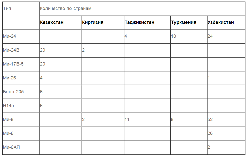 Если самолеты более применимы в условиях степей и пустынь, то для гор нужнее вертолеты. Тут лидером выступает Узбекистан — у него гораздо больше транспортных вертолетов. Если имеющиеся у него Ми-6 находятся в эксплуатации, то он может провести достаточно крупную операцию в горной местности без всяких проблем, доставив с помощью этих вертолетов как технику, так и личный состав. Правда, учитывая снятие их с производства и отказ от поддержки в самой России, это маловероятно.