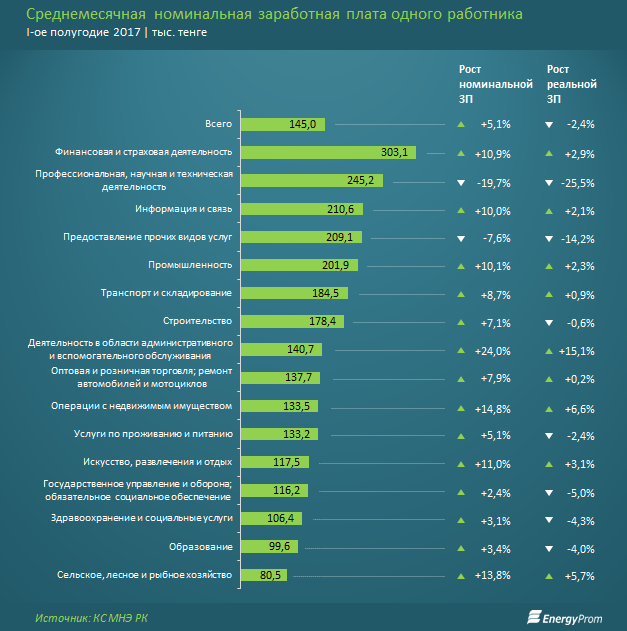Примечательно что, несмотря на курс страны на модернизацию и цифровизацию, сильнее всего ощутили снижение покупательской способности зарплат сотрудники профессиональной научной и технической сферы деятельности (-25,5% год-к-году). Номинальная заработная плата в научно-технических отраслях сократилась до 245,17 тыс. тг по итогам I полугодия, это на 19,7% меньше, чем в аналогичном периоде 2016.