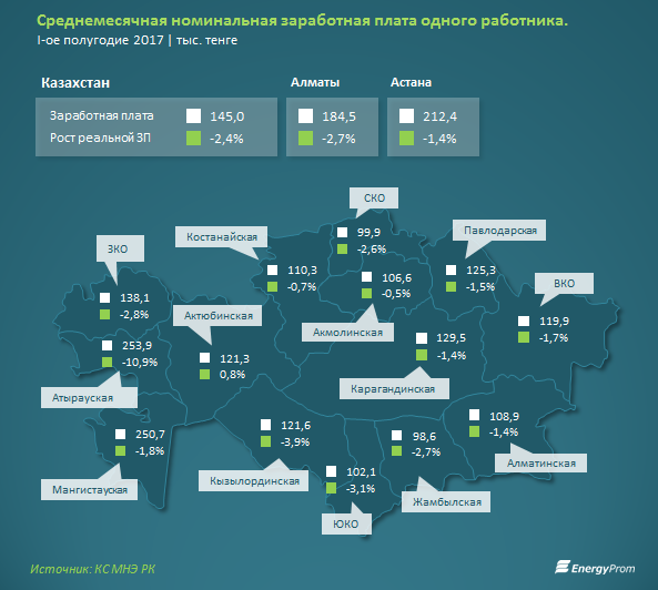 По итогам I полугодия 2017 среднемесячная номинальная заработная плата составляла 144,95 тысячи тенге - на 5,1% больше, чем в аналогичном периоде годом ранее.