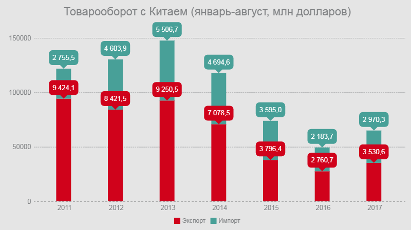 По итогам января-августа 2017 года товарооборот между Казахстаном и Китаем составил 6,5 млрд долларов – это на 31,5% выше показателей за аналогичный период 2016 года. Экспорт в Поднебесную вырос почти на 28% (до 3,5 млрд долларов), импорт – на 36% (почти до 3 млрд долларов).