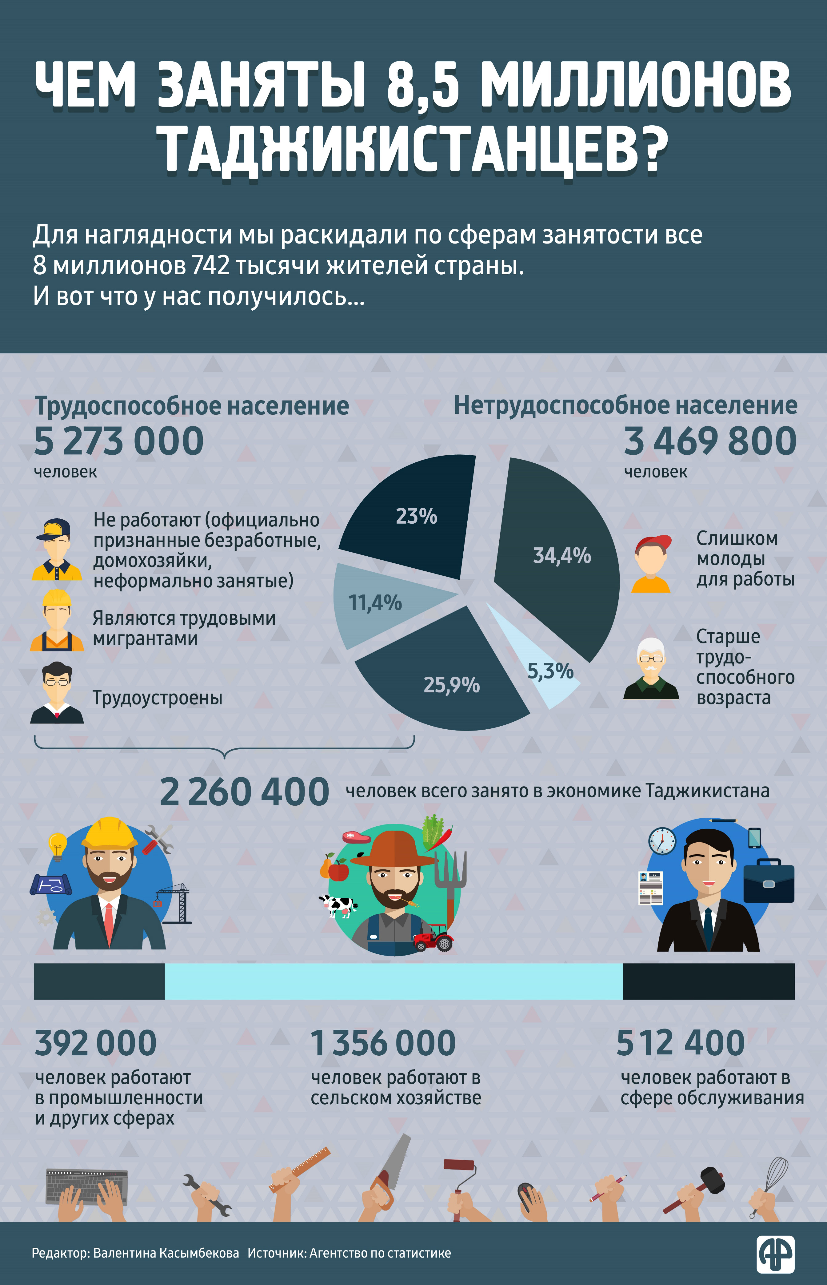 Нас уже 8,5 миллиона человек! По всему миру. Но задумывались ли вы когда-нибудь, а чем занимаются таджикистанцы? Молодая ли мы нация или у нас больше стариков? Какое количество из этих миллионов реально кормит страну, а сколько домохозяйничает дома или вовсе безработный? Мы попытались узнать.