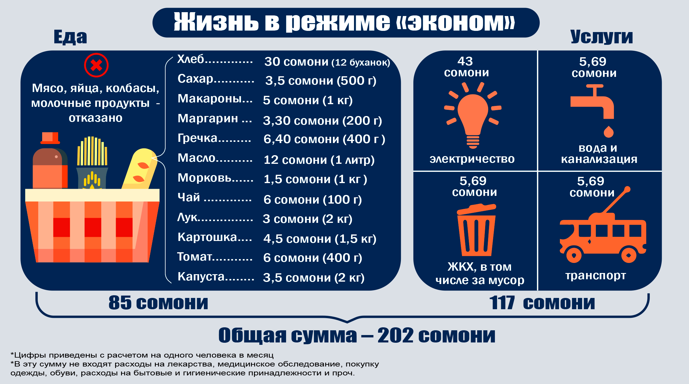 В итоге оказалось, что, если даже очень экономить, сумма месячных расходов составит больше 200 сомони, а это означает, что за чертой бедности может оказаться каждый второй одинокий пенсионер или инвалид, получающий пенсию в размере, например, 240 сомони.