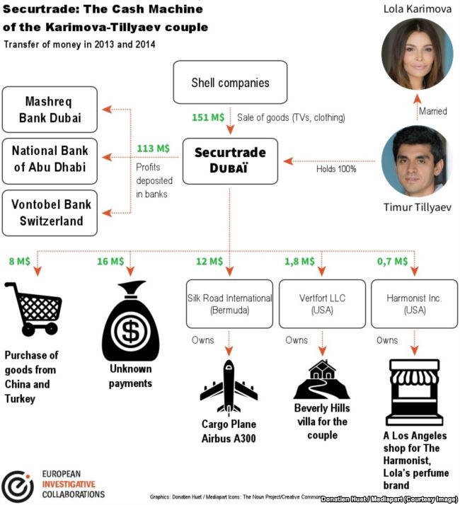 Авторы журналистского расследования, исходя из того, что сделки компании Лолы Каримовой и Тимура Тилляева и переводы с их банковских счетов осуществлялись через сложные оффшорные схемы на территории нескольких государств, решили приложить к статье специальную диаграмму, которая может помочь понять всю суть.