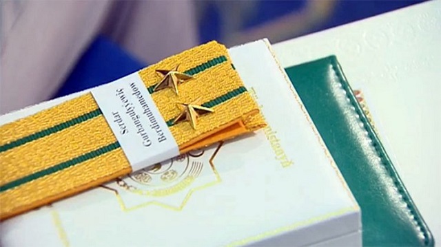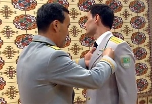 На церемонии награждения сотрудников силовых ведомств сын президента Бердымухамедова получил медаль за особые заслуги перед отечеством. Награда носит имя его дедушки — Мяликгулы Бердымухамедова.